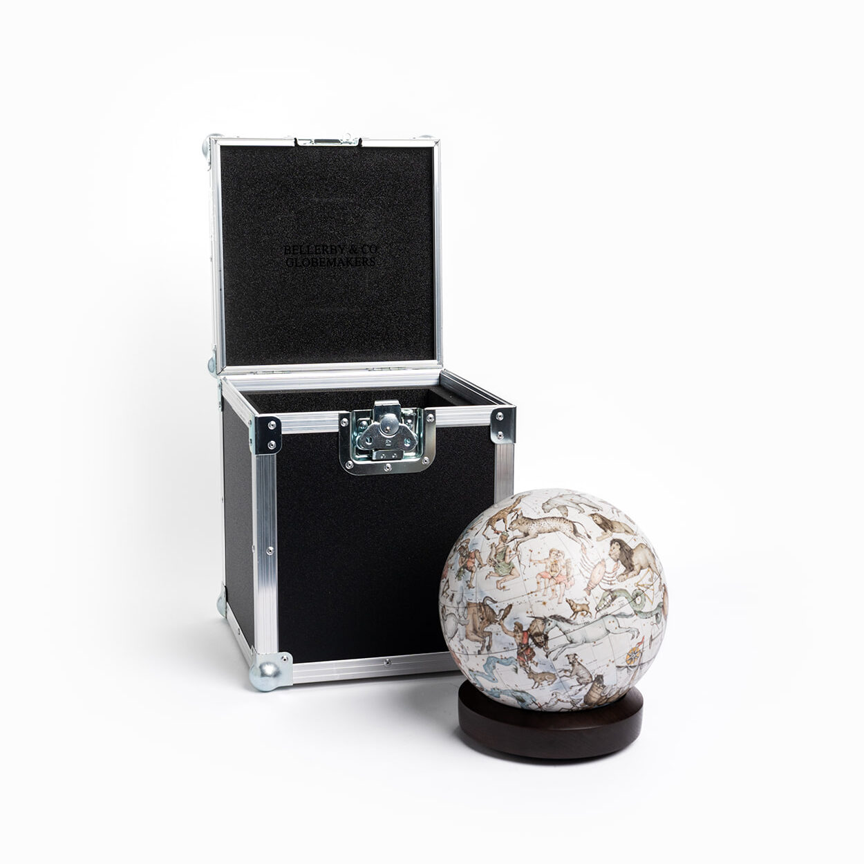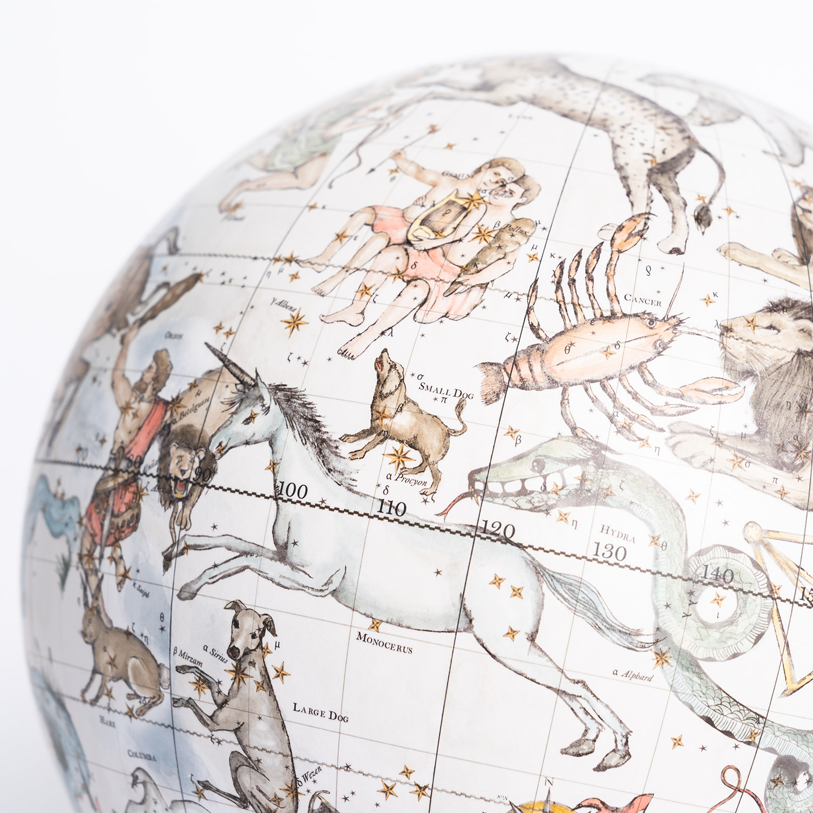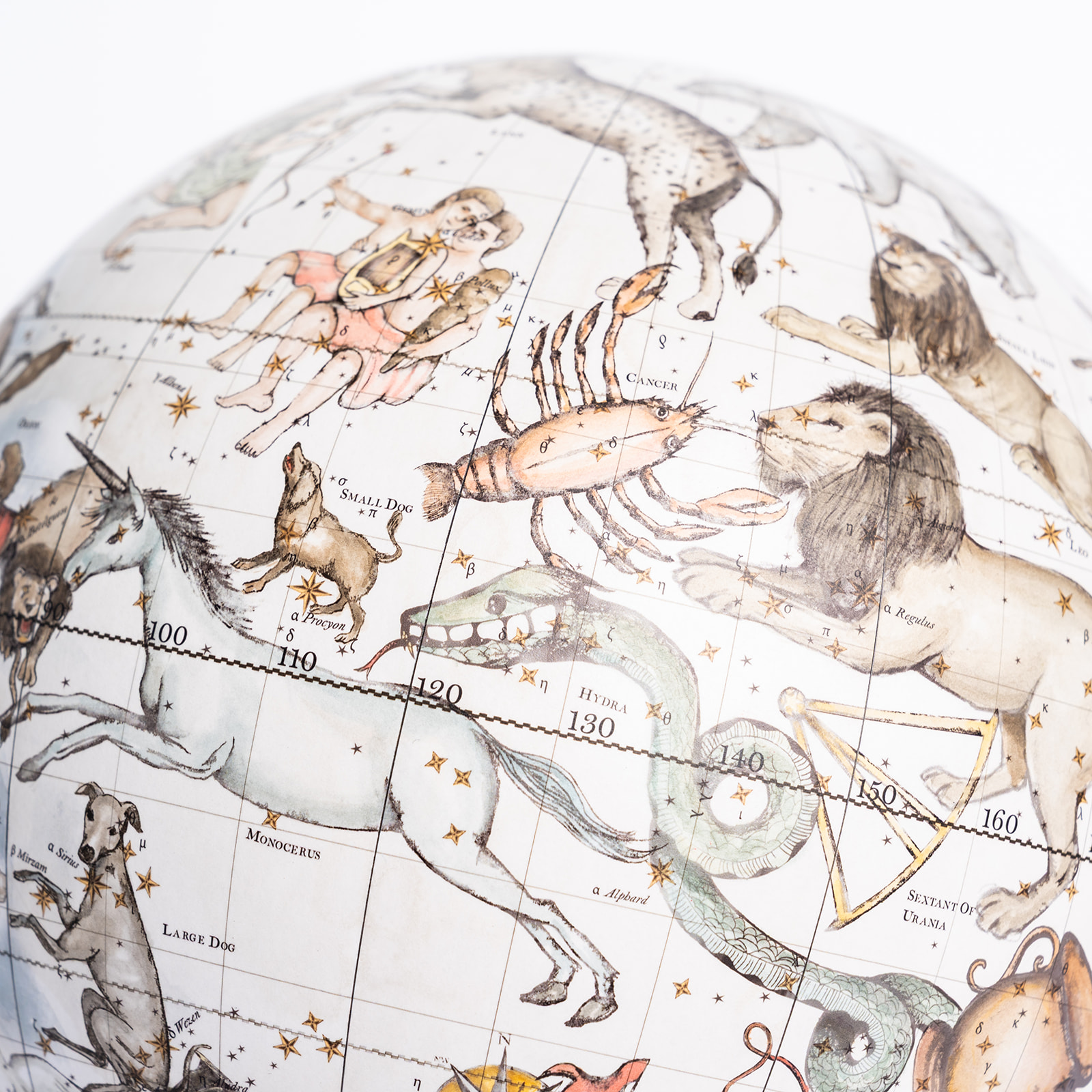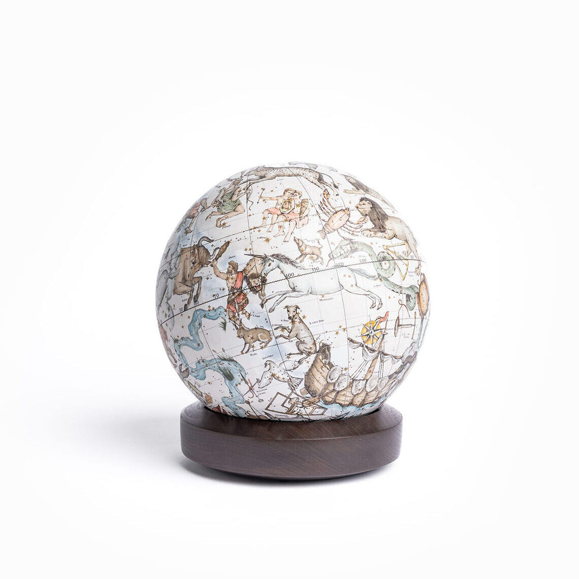 Celestial globes are spherical maps of the night sky showing the positions of stars and constellations as seen from Earth. This entirely handmade globe, watercolored by hand, depicts all 88 recognized constellations. Used since Ancient Greece to study and navigate by the heavens, celestial navigation remains an essential GPS backup for navies and ship captains worldwide.