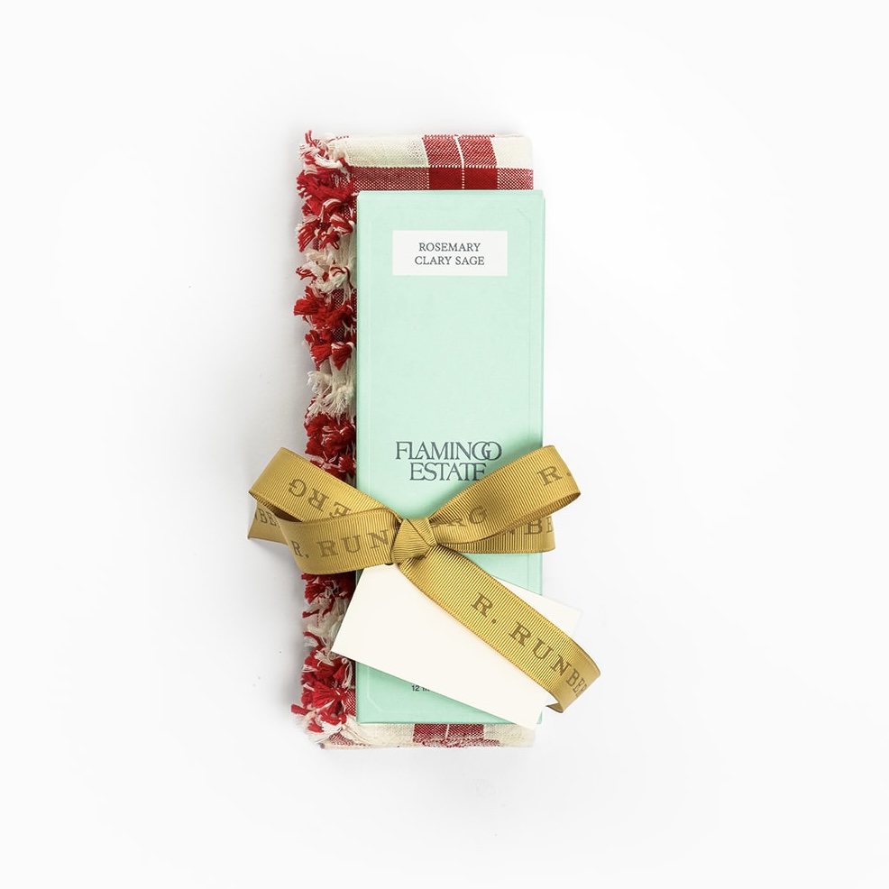 This gift pairs the award-winning Flamingo Estate hand soap with a beautifully handwoven cotton tea towel—a thoughtful combination for any kitchen or powder room. The absorbent, durable towel from Heather Taylor Home is finely woven on traditional backstrap looms in Chiapas, Mexico. The soap is made with olive and babassu oils, thickened with sea salt for a honey-like texture, and contains six times more essential oils than most brands: handpicked clary sage, Australian eucalyptus, Mediterranean rosemary, and California lavender.