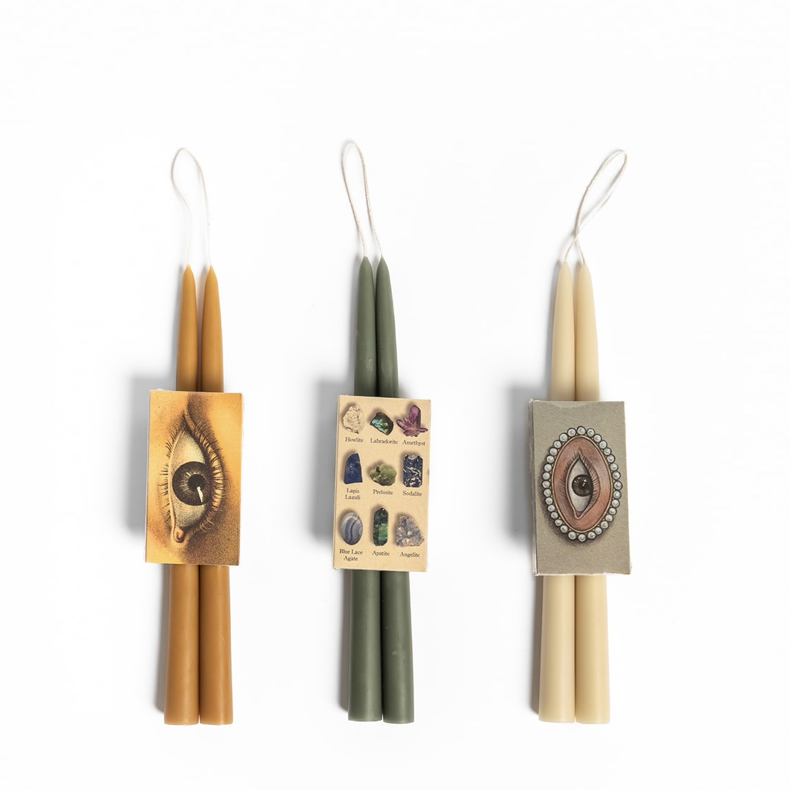 A taper candle pair and complementary patterned wooden match box are tied with our signature ribbon and tag—a charming, useful gift to have on hand year-round for neighbors, teachers, and hosts. Choose from several themed sets of three: 18″ Christmas, 12″ Christmas, 12″ botanicals, 12″ eyes and minerals.